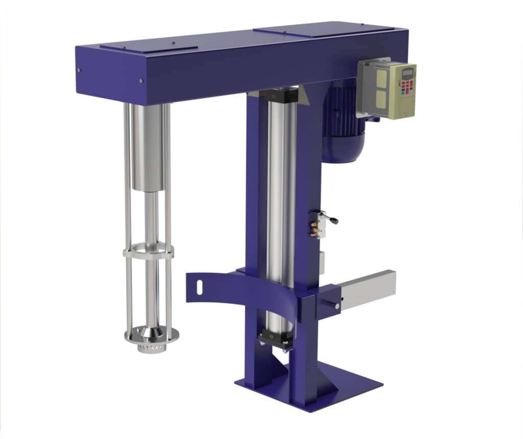 MC-C-RS post mount rotor stator is the best value for effective high shear mixing in 55-gallon drums. The IMC-C-RS rotor stator provides the power you need to get the job done, whether you’re mixing paints, cosmetics, or simply require more shear to produce the perfect result. The IMC-C-RS can easily reach your process goals and is available in 5HP or 10HP with either standard electric motors or explosion proof electric motors. IMC-C-RS can handle a 40″ diameter vessel with a 36″ lift. The air lift uses a 3-way air valve to gently move in and out of position, allowing the rotor stator to be put anywhere inside the mixing container. This feature is useful if you’ll be mixing items with different viscosities. For further versatility, IMC-C-RS comes standard with an angle slotted stator that can be quickly and simply replaced with a general purpose or Emulser stator. IMC-C-RS’s speed may be readily regulated using a VFD with a digital readout to assure optimal mixing velocities ranging from 0 to 3600 RPM. If the standard configurations of the IMC-C-RS does not suit your needs exactly, contact us for a quote!